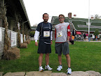 Lets see...This was my first non chip race. (granted it was only my 4th race ever....). For a small race there appeared to be alot of people - but i guess it was a small space. There was no pre-race countdown - just the opening gun fire to start. It took us all by surprise. Took us about 30 seconds to cross the start line. The first mile took 9:04 to run. It was way too fast. I heard Drew yell up to me that we were going to fast. So I slowed down....or did I. Passed the second mile marker - 9:05 pace. Again - too fast..so I slowed down...or did I. Third mile - 9:05 pace. (see a pattern forming here?) Each mile was exactly the same - 9:04 to 9:06 pace - too fast - my saying to slow down - me not slowing down.